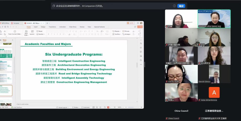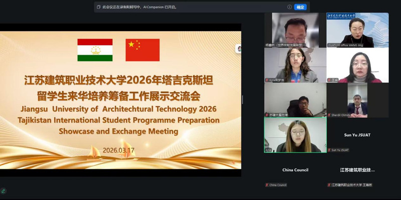 为扎实推进2026年塔吉克斯坦留学生来华培养工作,加强中塔职业教育合作,我校于2026年3月17日下午通过线上平台,召开2026年塔吉克斯坦留学生来华培养筹备工作交流会。会议由我校与塔吉克斯坦教育与科学部国际项目中心共同组织。塔方代表包括塔教育与科学部国际项目中心副主任托吉迪尼·巴赫里丁、项目专员阿齐扎霍恩·阿利马尔多诺娃;中方参会人员包括江苏建筑职业技术大学国际处副处长王静、建筑装饰学院院长王峰、副院长翟胜增,国际处相关科室负责人,以及经中塔技术技能提升建设联盟和世界技能发展联盟代表。